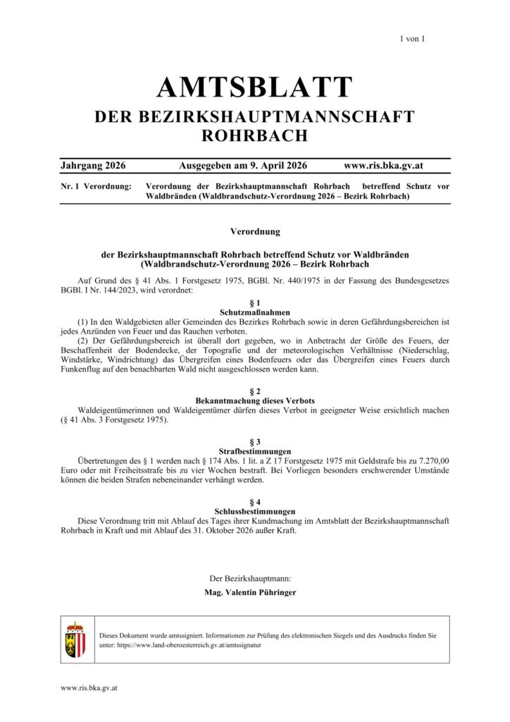 Seit 09.04.2026 gilt die Waldbrandschutzverordnung im Bezirk Rohrbach.